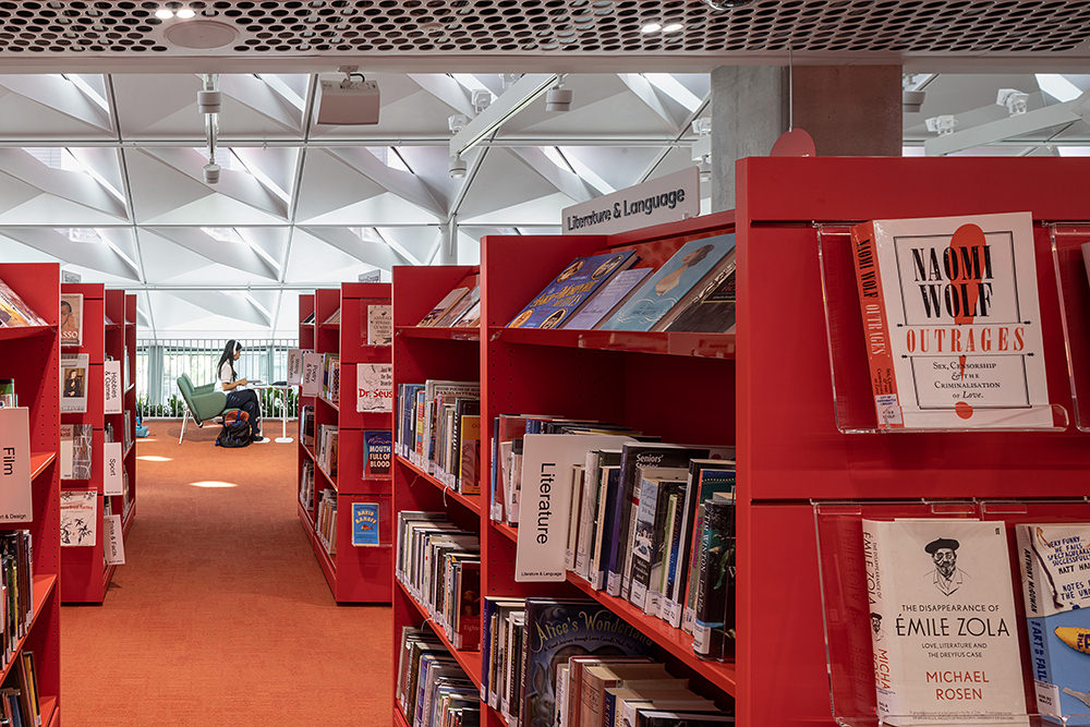 IntraSpace worked extensively over a couple of years with DesignInc Sydney to fully design the custom built-in library shelving. The design incorporates static and mobile shelving, along with custom red colour shelves, hidden castors, bulkheads with LED lights, to name a few. The kids’ area boasts plywood shelving with acrylic book tubs and slatwall displays.